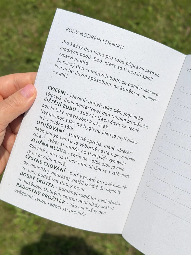 Tento deník není jen papírový blok – je to most mezi rodičem a dítětem, dítětem a jeho snahou být lepší, dnem, kdy společně budujete hodnoty. Každá modrá hvězdička je malým vítězstvím – jako když děti začnou opravdu rozumět síle slušnosti, odpovědnosti a laskavosti.