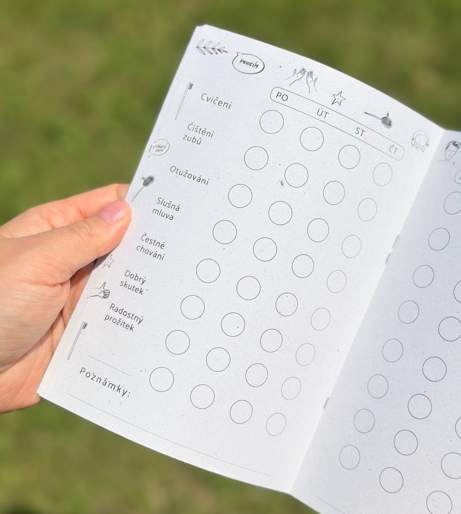 Na každé stránce čekají modré body – malé denní úkoly, které pomáhají pěstovat zdravé návyky a dobré chování: cvičení, pravidelné čištění zubů, otužování, slušná slova, čestné chování, dobré skutky i uvědomění si radosti dne. Tobě rodiči se otevře možnost je při tom doprovázet – a děti si mohou za každodenní úspěch odměnit modrou hvězdičkou ze samolepky. Navíc každý měsíc obsahuje měsíční úkoly, za jejichž splnění si spolu můžete domluvit třeba malou odměnu.